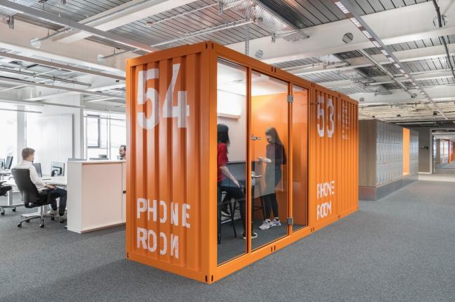 而在大楼的每一层,这条主干道式的走廊则会与六个厨房模块相连。建筑师采用了差异化的材料、色彩和家具形式区分这六个模块,旨在赋予各个厨房于楼内的专属地址。同时,这六个具备不同特征的厨房,还会不同程度地影响周边办公区域的环境氛围。分布于三层的各个工作区域,都是以正式会议、日常交流和娱乐休闲这三种空间形式交替而成的。建筑师还给它们配备了不同尺寸和色彩的照明系统,以为其提供充足的室内光照。