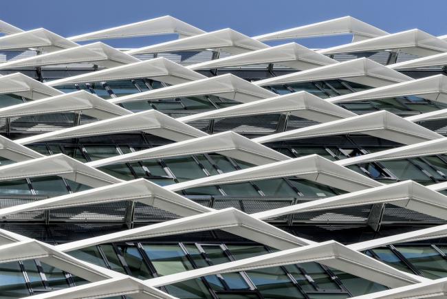 在立面设计上,建筑师采用了定制的遮阳控制系统,以在冬季提供最强光照,夏季引入最少热量。这套遮阳系统以铝制金属为框架,并搭配不透明的穿孔板作为遮盖面板。同时,得益于大量可循环材料的使用和最新节能标准的指导,这栋新落成的办公大楼还提交了 LEED 绿色建筑的金级认证标准申请。
