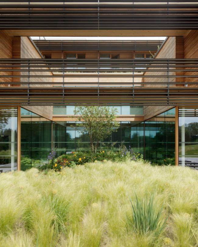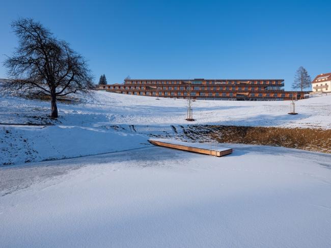 自然地形的景观在结构之间延续。所有房间都有良好的文化景观视野。研讨会区和繁忙的初级保健诊所不仅拥有良好的景观视线,还提供了通往自然的便捷地面出口。沐浴和桑拿区位于建筑南部的地形基础之上,在那里可以欣赏木屑小径与池塘景观。
