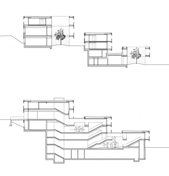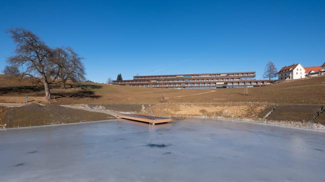 该项目将建筑与景观融合在一起,旨在创造该地区人与自然之间的和谐氛围。设计场地属于该地区典型的果园草地。三个狭长的结构被设置在类似竞技场的场地中,使得建筑有时看起来像是盘旋在地面上,有时则是嵌入到地形中。