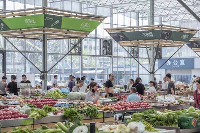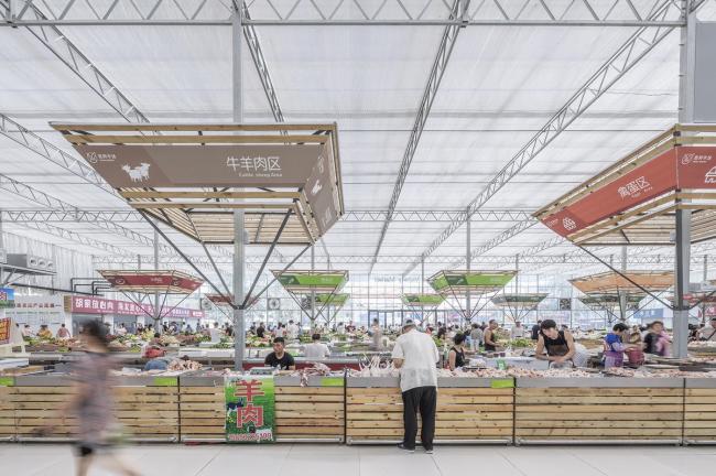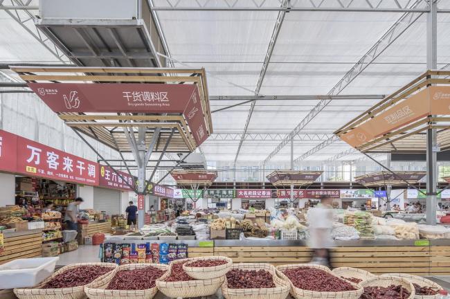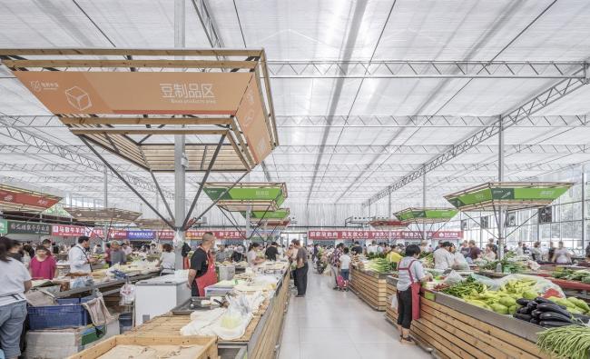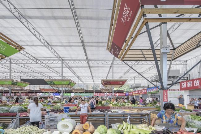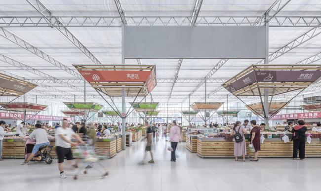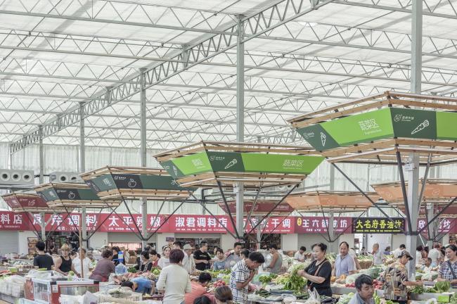 标准的工业大棚空间,是均质而无序的。常规菜市场的问题就是辨识混乱,如何通过必要的增建,在无序的空间里营造出秩序,方便贩卖管理和市民采购,是设计的第二个议题。增建添加必须满足两个条件:尊重和利用现有结构和构造杆件的模数、新增建造是非标准构件(再用性弱)必须低造价。