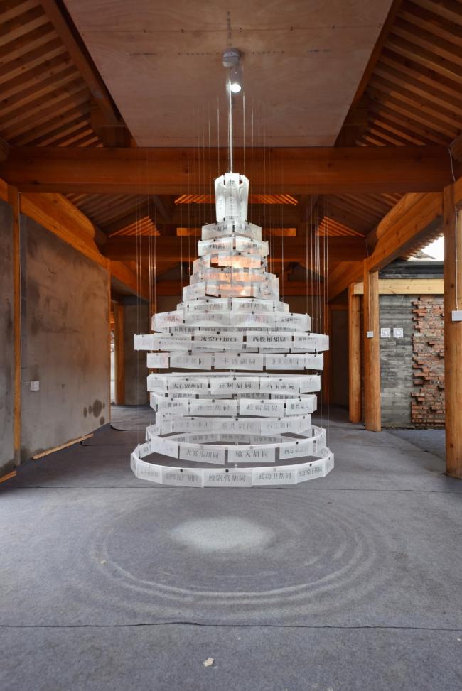 “胡同营造”试图将四合院建筑的材料产品化,展览由3家建筑设计事务所共同发起 , 每一家建筑事务所通过单一构件或材料进行创新设计,采用不同的展览形式阐述同一观点: 保护风貌、传承工艺、提倡环保、塑造特征。