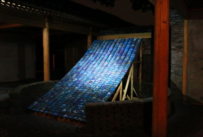 本次展览展品我们取名为《飞檐》,飞檐本身的含义是在房檐上行走,我们利用艺术化的瓦片将屋顶的形式建造在地面上,人们参观的状态跟飞檐就产生了相关性和相似性,原本看不到的屋顶转化为了(BIM工作)参观的展品,同时我们利用艺术化的灰砖组合形成一个具有围合感、几何感的场域空间,砖与瓦片一起呈现出一个现代“屋顶”的全新感受。