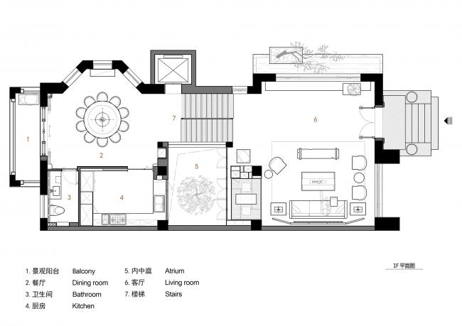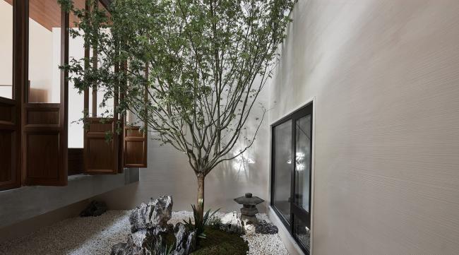 本案业主是一对园林设计师,对生活向往宁静,喜欢一切自然的事物。空间结构非常有特点,地下室、一层、二层都是错层结构,让每一楼层与上下空间都有互动,让人与人、人与空间多了几分场景交流,这就是空间本来该有的面貌,处处流露着生活的细节。整个空间以中间天井与楼梯展开思索,天井种下一棵老宅挪过来的绿枫树,地下室房间、一楼客厅的茶区、二楼厨房都以天井绿植展开,每处都与自然和谐融合,充满着生活的气息。