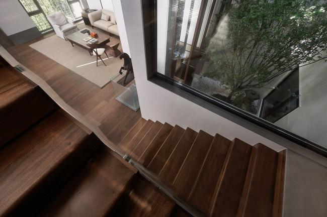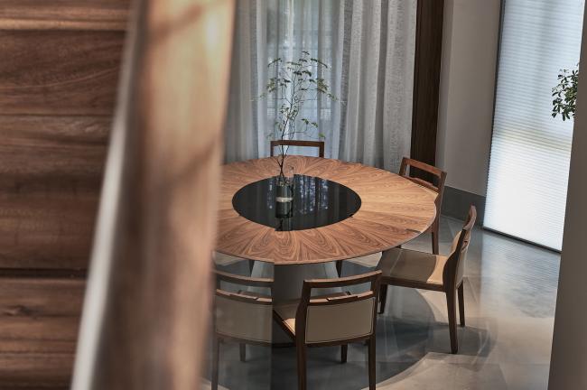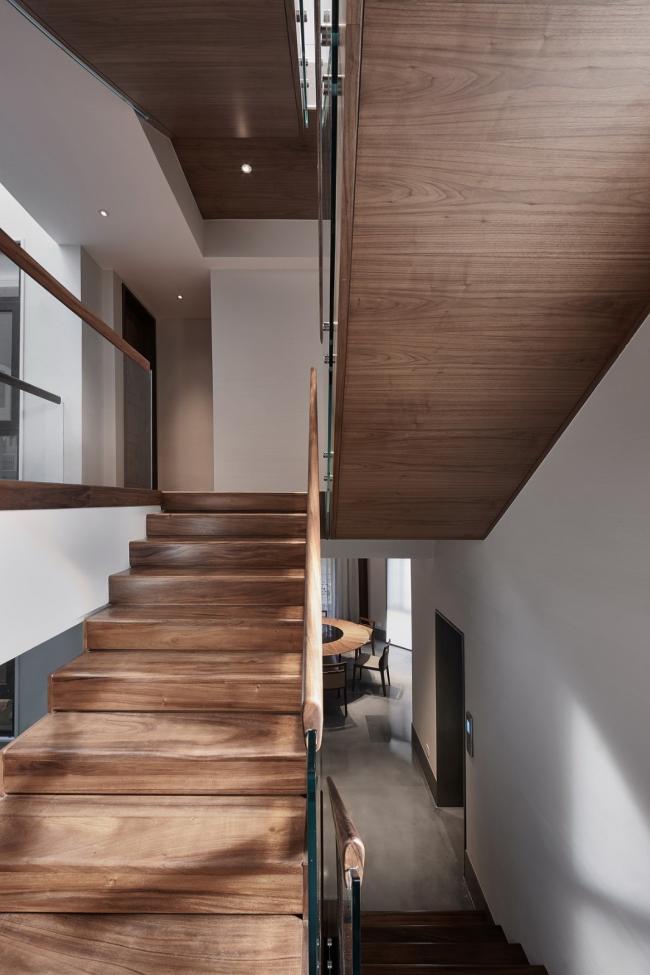 整条楼梯以北美胡桃木拼接,让原本多层的楼梯分隔开左右两边的空间(BIM设计),少了几分硬度,多了几分温度,边界模糊化,让整个上下楼层有了情感的链接。