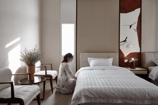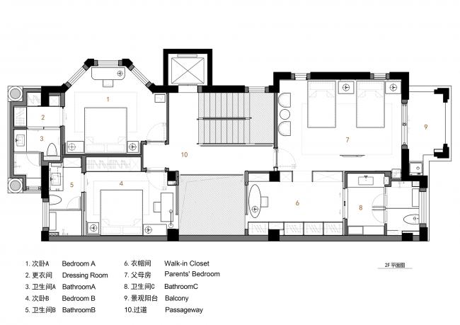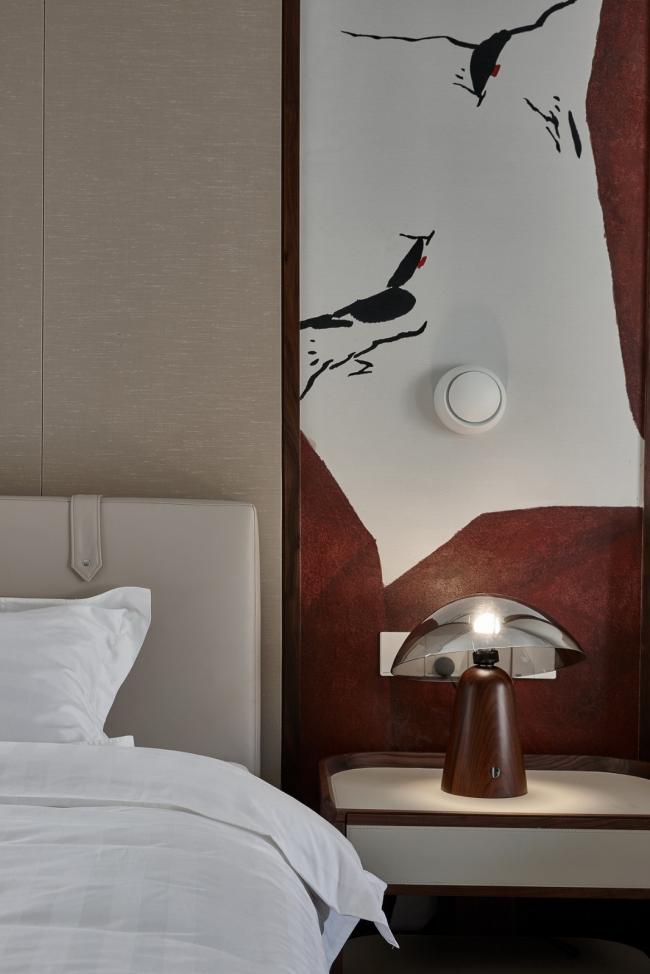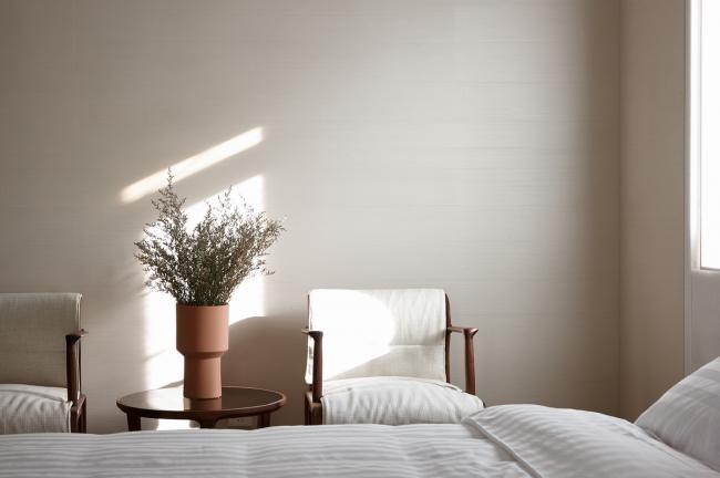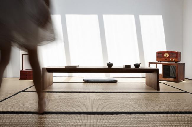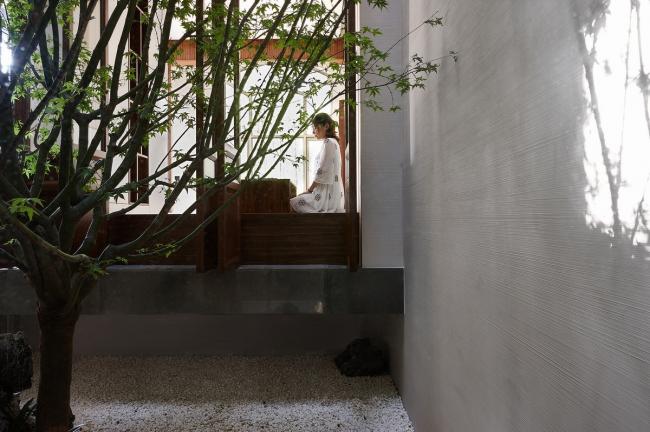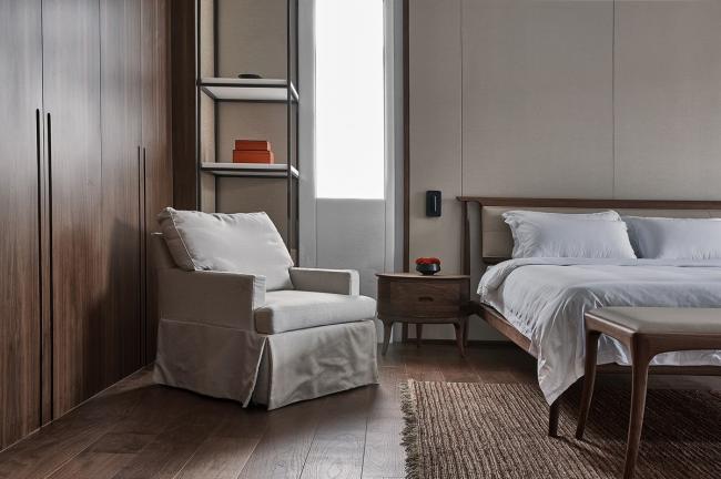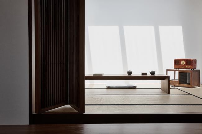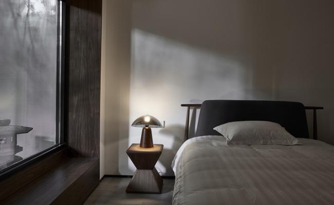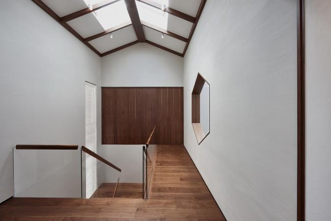 三楼部分,整层为主人区域,楼梯上端开了一个天井窗,让充足的阳光可以洒下来,主卧区域通过设计成几扇屏风式开门,让打开的时候与开放书房区域可以共通,业主喜欢阅读,有大量书籍收藏,整个设计成阵列式的藏书方式。书房分为阅读区与和室区域,让人在其中可以选择不同的场景方式,阅读、品茶与休息。这不乏是一种舒适的生活方式。