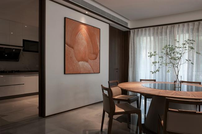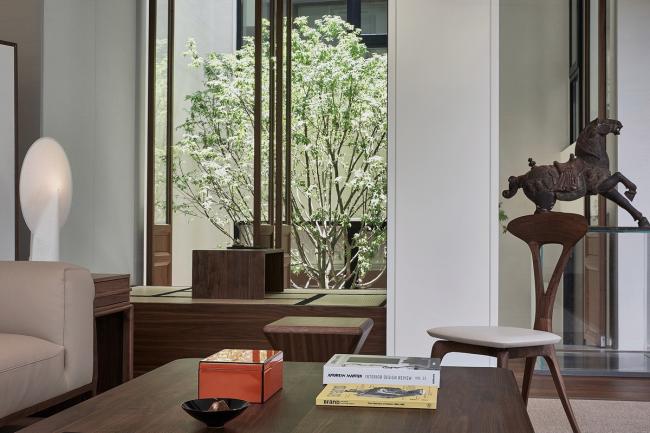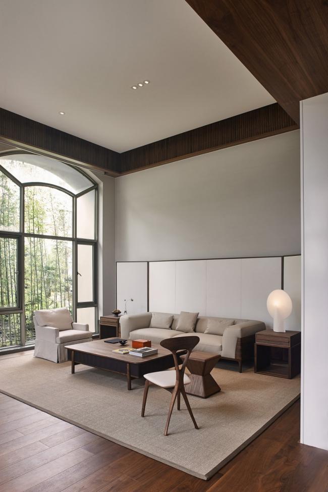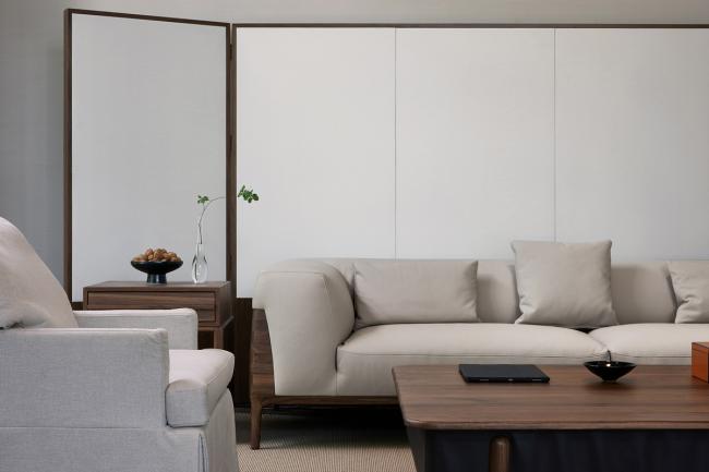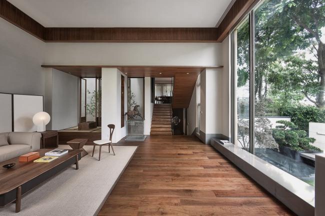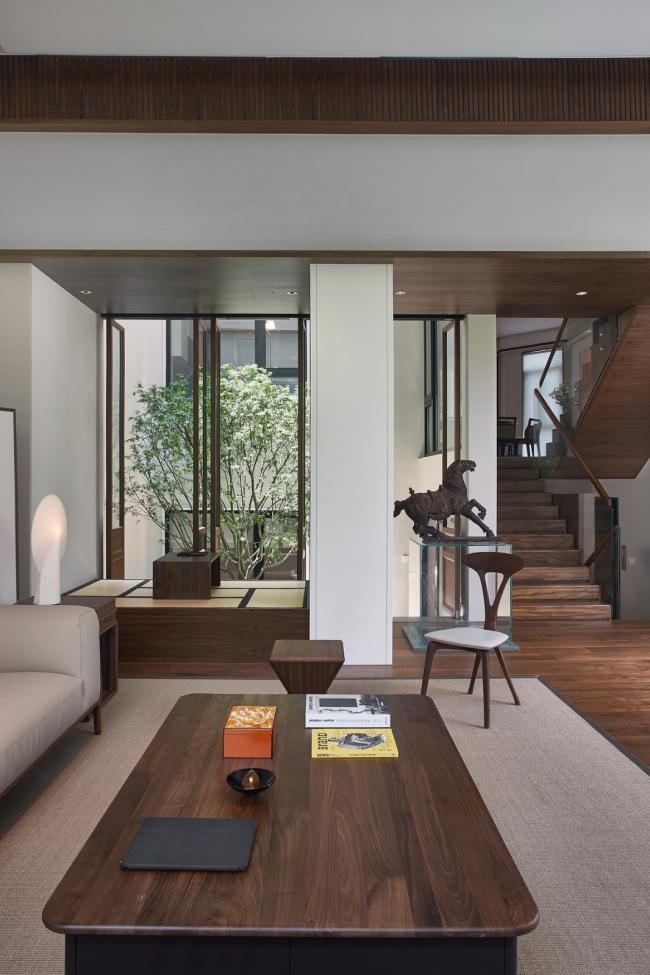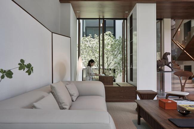 一楼整个客厅保留原有墙体结构,用白色拉丝艺术漆作为主基调,通过正面落地玻璃,让花园园林景观作为客厅主背景,充分尊重自然的力量,让空间与室外达到自然和谐共生,让每一位在里面的人,心可以打开,与自然对话。客厅利用原有的结构柱子设计成开放式的和室品茶区,品茶区与天井之间加了活动胡桃木屏风,让此区域在一开一合之间与绿植、阳光、空气发生关系。