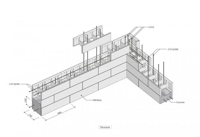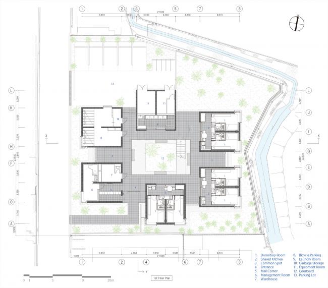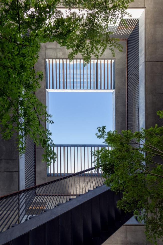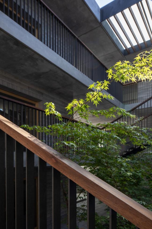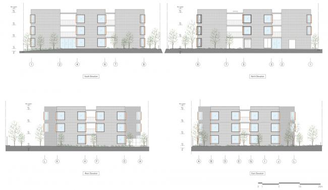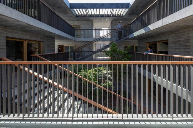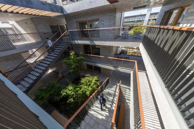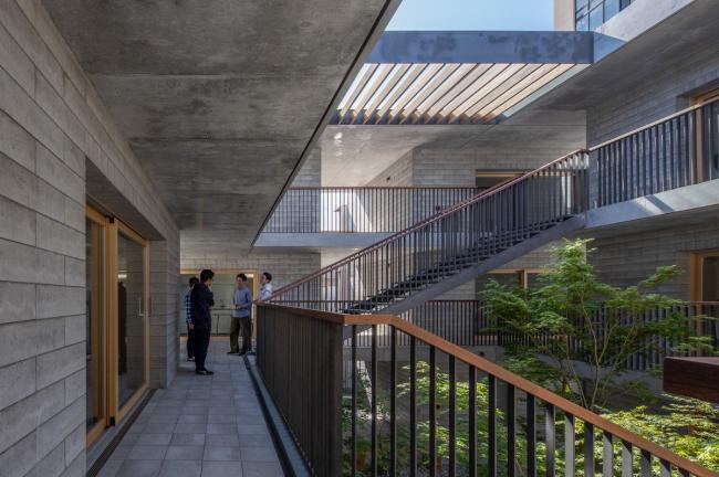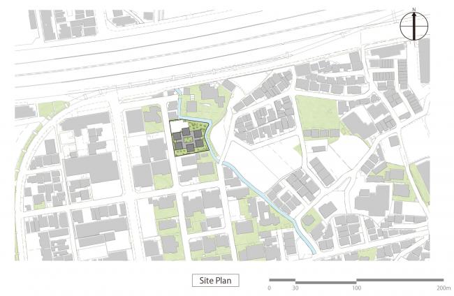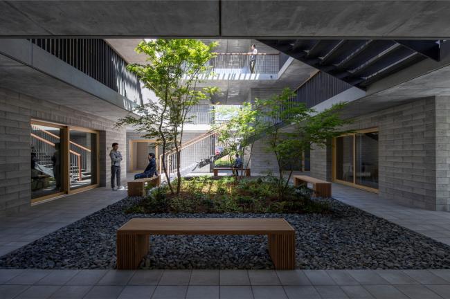 这块地位于一个老居民区。我们把建筑分成六个体量,建筑一共三层,降低了高度,以呼应周围房屋的比例。