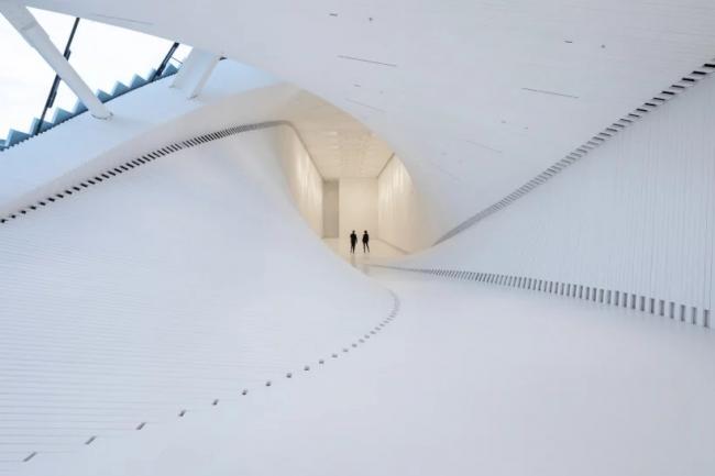 与baumetal合作开发的直铝板被布置成一堆书的模样,以创造博物馆的双曲线几何形状,同样的原理在内部也有运用。“无论你看向哪里,你都能看到拱门和曲线、斐波那契螺旋和马鞍形,但当你仔细看时,你会发现一切都是由直线创造的——直线的铝板、直线的木板,”英格尔斯接着说。“合理重复的元素组成了富有表现力的有机雕塑。”
