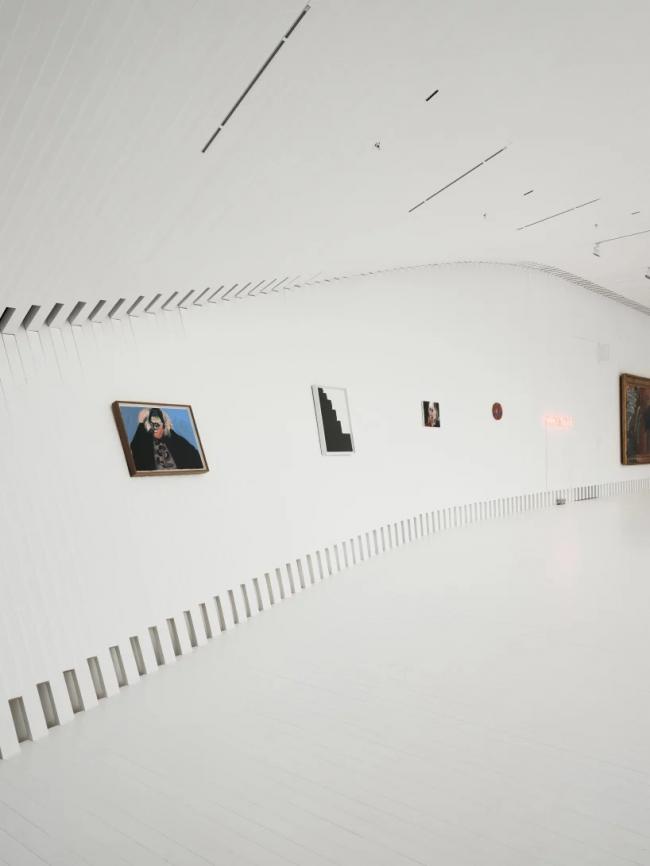 作为“景观中的连续路径”,建筑的两边都是主入口。从南部,游客通过一个戏剧性的双高空间进入,清晰的视线贯穿整个建筑,一直延伸到北入口。相反,从北部到达的客人进入一个全景空间,在那里可以看到场地上的纸浆厂和周围的景观。通过弧形玻璃窗进入的不同类型的日光创造了三个独特的画廊:一个宽阔、自然采光,具有北侧全景的画廊;一个高大、黑暗的,南面有人工照明的画廊;中间是一个带有扭曲银条的顶部采光的雕塑空间。