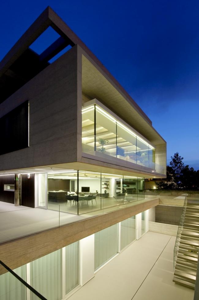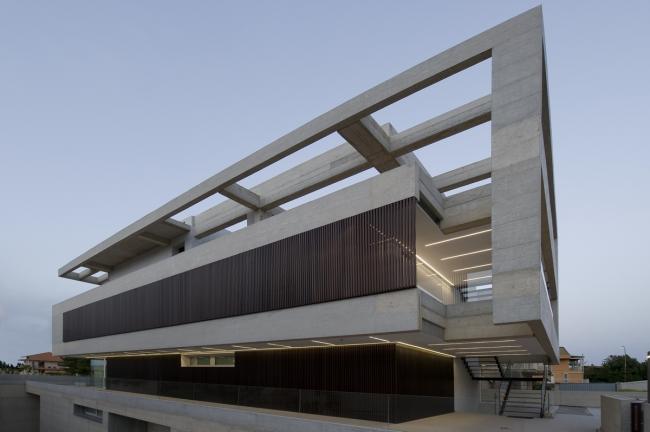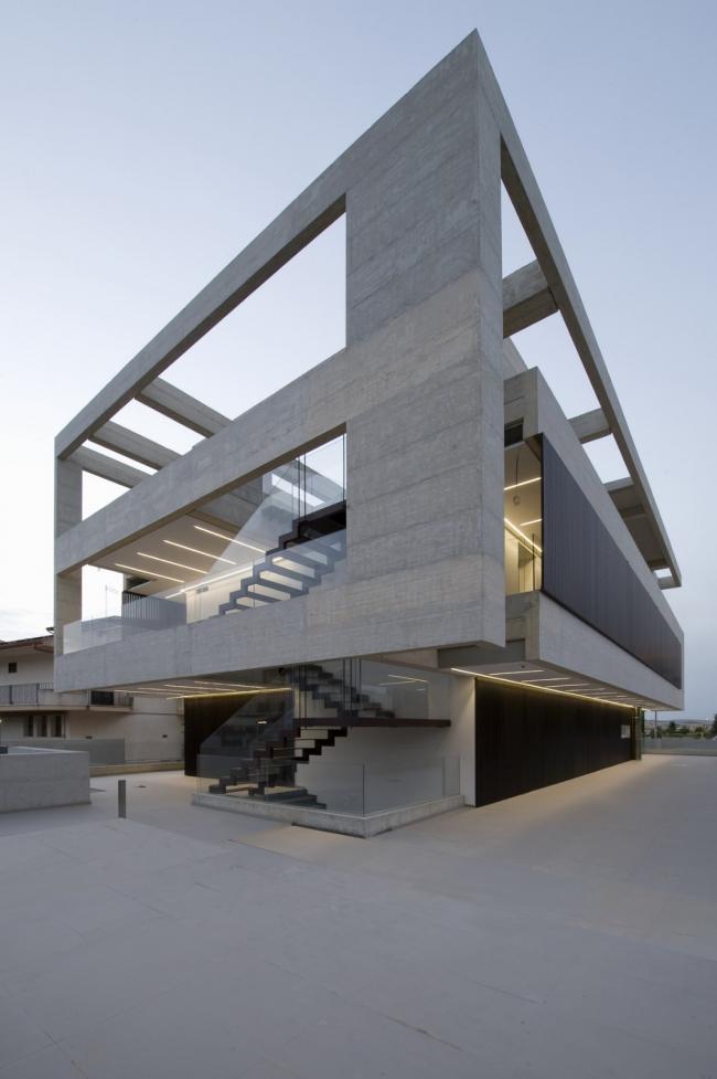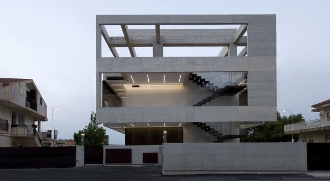 在设计这栋建筑的时候,主要的想法是通过在四周建造一级悬挑并有相当部分悬挑朝向大街的方式,将它从周围的建筑中解放出来。第二个想法是考虑材料、混凝土,这决定了模板的设计。建筑采用整体设计,将内外部整合起来。在内外部空间规划上,尽管是两个不同的住户,但材料的使用具有共同的特点。你从后面的内部通道进入大楼,在那一侧,建筑的特点是一个结构网格,从那里凸显出来,并带有一个非常轻的嵌入式钢楼梯,与混凝土结构形成了对比。