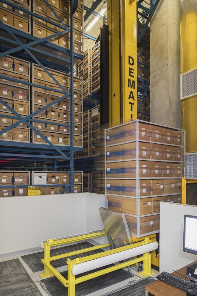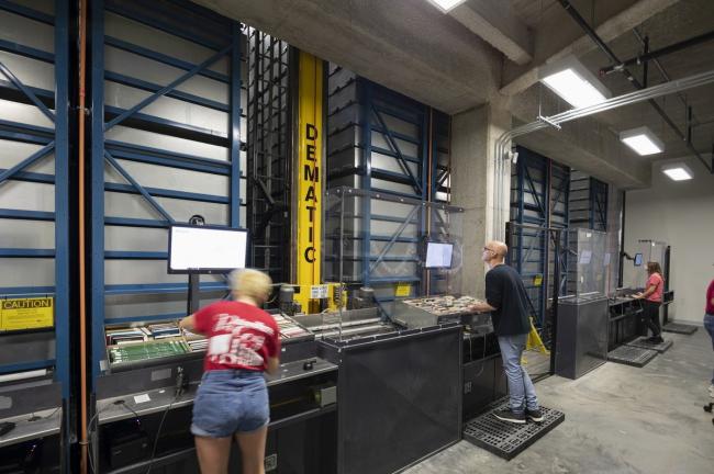 在主楼梯的底部,一站式服务台提供了图书馆工作人员和学生之间的第一个连接,方便他们访问主要存储在高密度自动存储和检索系统(ASRS)中的图书馆藏书,它被亲切地称为“bookbot”。57英尺高,跨越大楼三层,容量近200万册书籍的空间,目前存储150万册,允许以前存放在异地仓库中的馆藏书籍在现场重新安置。通过大幅度减少图书存储所需的空间,扩大访问图书馆藏书的通道,bookbot为协作学习、学术资源和个人学习提供了更大的空间。