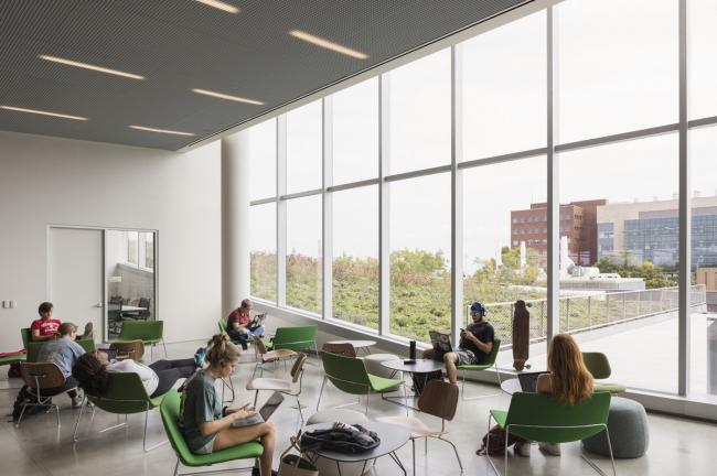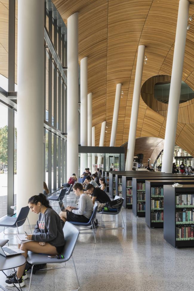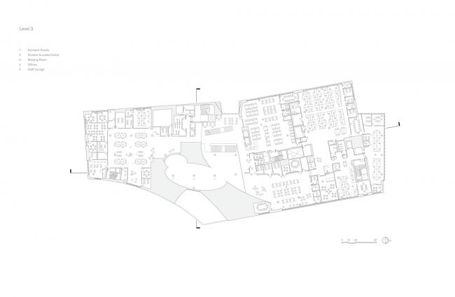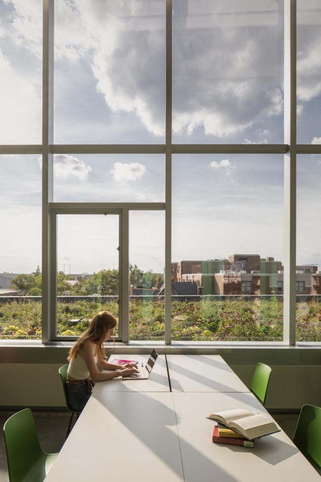 图书馆在针对当代学生新兴的需求,提供独一无二的多样化的定制空间项目的同时,也提供了传统学术型图书馆专注的研究体验。宁静、阳光沐浴的四楼鼓励游客漫步于图书馆可浏览的藏书堆中。有大约20万册的书被放置在这个空间的中心,而更多的私人学习空间排列在周围。在四楼南北两端是两个宽敞的阅览室,专门用于研究生、教员和本科生的学习。四面都是玻璃,并可以看到茂盛的绿色屋顶,四楼给人一种置身于大自然中的感觉。作为一个放大的草地景观,观赏性的草地和多年生草本植物构成了这些阅读园的基础,在这里,一年四季都会出现一些经过管理的开花物种和鳞茎,点缀着色彩和趣味。屋顶花园由超过15种不同的植物组成,为授粉昆虫提供了丰富的城市栖息地,并为图书馆内部提供了一个校园和城市的平静的视觉前景。
