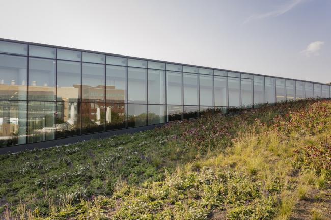 47300平方英尺的绿色屋顶覆盖了该建筑70%以上的屋顶表面,它是宾夕法尼亚州最大的绿色屋顶之一,在该建筑的雨水管理系统中也起着关键作用。查尔斯图书馆网站的设计是为了捕捉和保留最大的雨水,包括不仅来自坦普尔校园,而且还来自费城老化的基础设施的雨水,这些老化的基础设施在历史上的暴雨事件中负担过重。旨在满足提高的费城水务局的指导方针,图书馆的雨水管理系统,包括绿色屋顶,地面可渗水广场和道路,园景种植地渗透雨水,以及两个可以一起存储和在暴风雨期间处理将近50万加仑水的地下集水盆地。总而言之,该项目管理了大约3英亩场地上的所有雨水径流,以及额外一英亩的场外不透水地面。