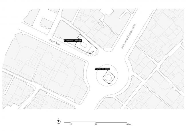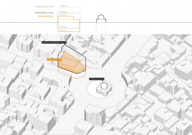 项目场地位于历史街区内,面积571平方米,毗邻具有400年历史的优秀建筑遗产Gonbad-e-Sabz。Gonbad-e-Sabz深受人们的尊敬,因为它是著名的萨法维神秘主义者Sheikh Mohammad Momen的坟墓,也是一个社交聚会场所。这座坟墓附近的高层建筑肆意发展,不顾公共利益,给它周边以及场地的神圣性带来了耻辱。