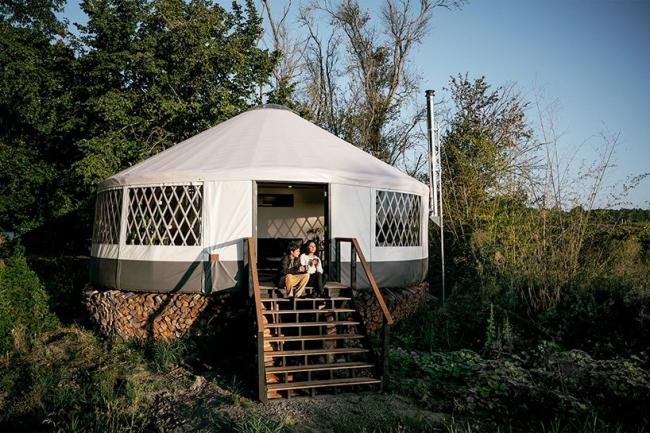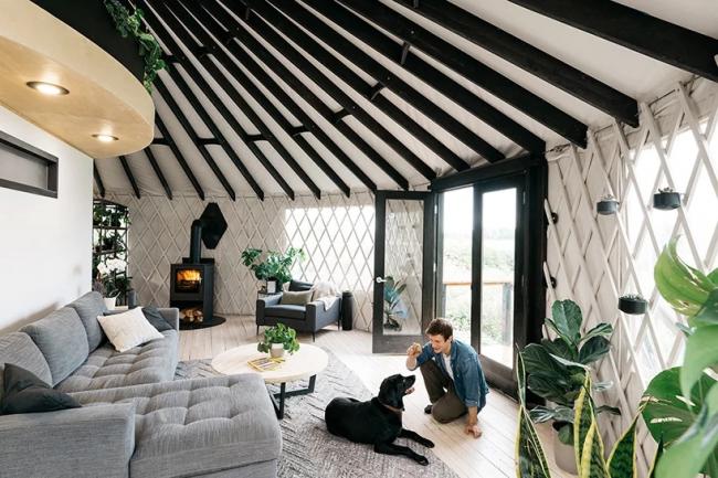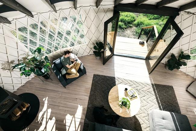 扎克·博特和妮可·洛佩兹设计的蒙古包直径只有30多英尺,占地730平方英尺,充满光线的生活空间里配有现代化的固定装置和电器,水电,以及为访客提供的充足的空间。在一个周末,两人在朋友和家人的帮助下搭建了外部结构。在内部,空间围绕着一个大型的中央单元进行配置,该单元包括厨房和浴室,在其顶部布置了一个卧室阁楼。这个圆形的睡眠区有一个盛装着45株植物的花盆和一个宽敞的天窗,可以在白天一整天都引入充足的阳光。