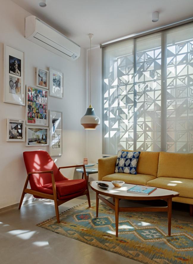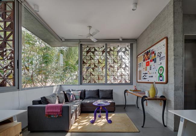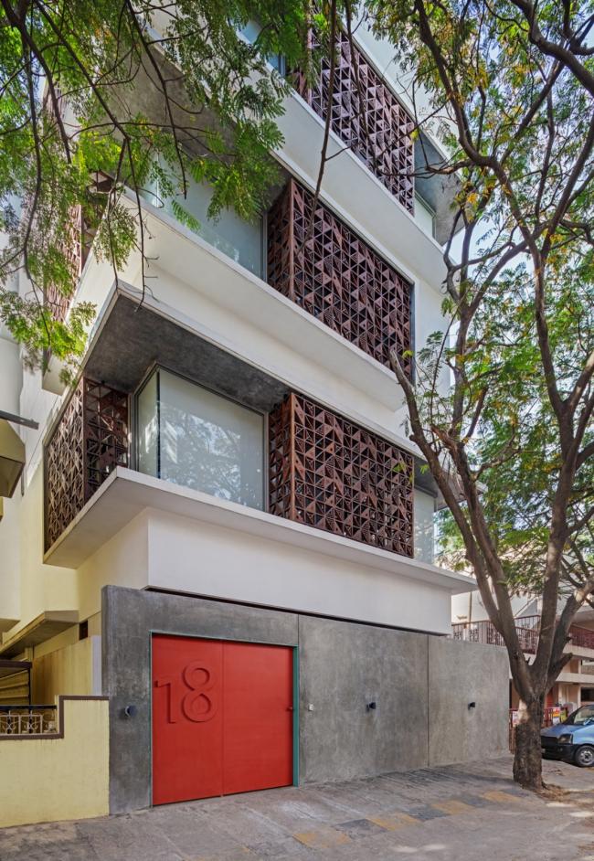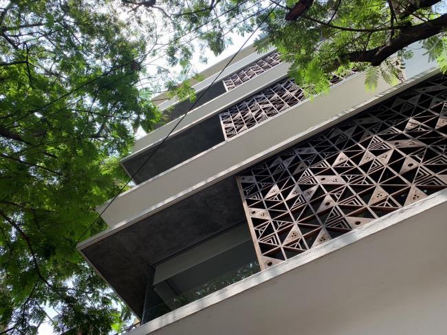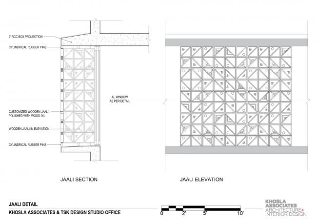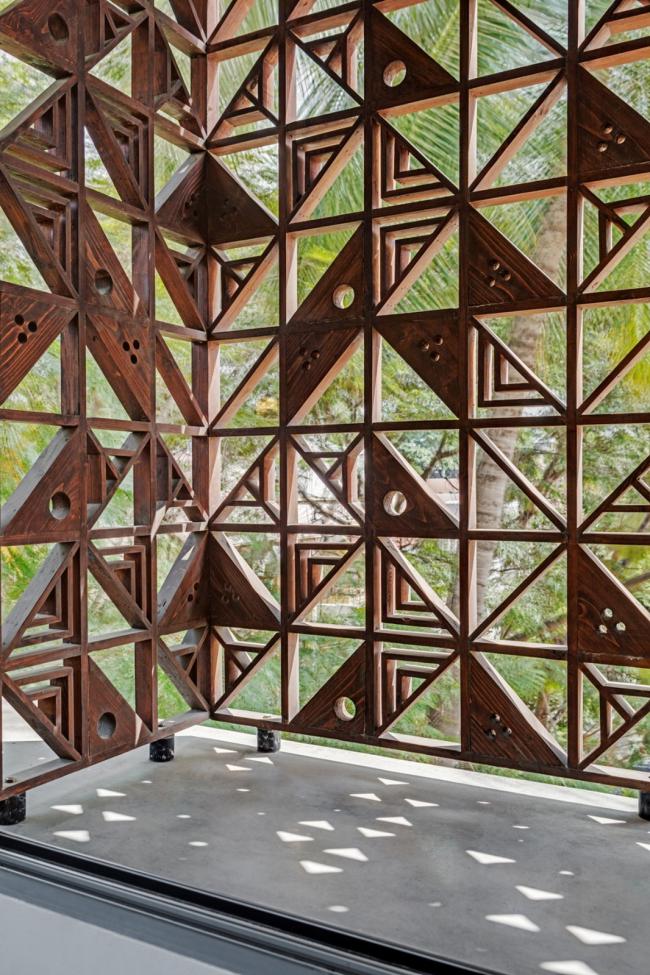 每一层外部都有一圈2(BIM培训)英尺宽的悬挑遮阳板来遮挡阳光和雨水。我们设计了一套木制方形格子屏(Jaali)系统来保护可开启窗扇。格子屏的图案来源于 Sandeep 和 Tania 为 Bharat 地板设计的异想天开的“Dashdashdot”系列水磨石瓷砖,它也用作工作室接待处引人注目的垂直背景。木质格子屏在白天能够过滤日光,屏蔽某些不受欢迎的画面,允许自然通风。它在为建筑提供一层安全屏障的同时,也活跃了白天的室内空间。