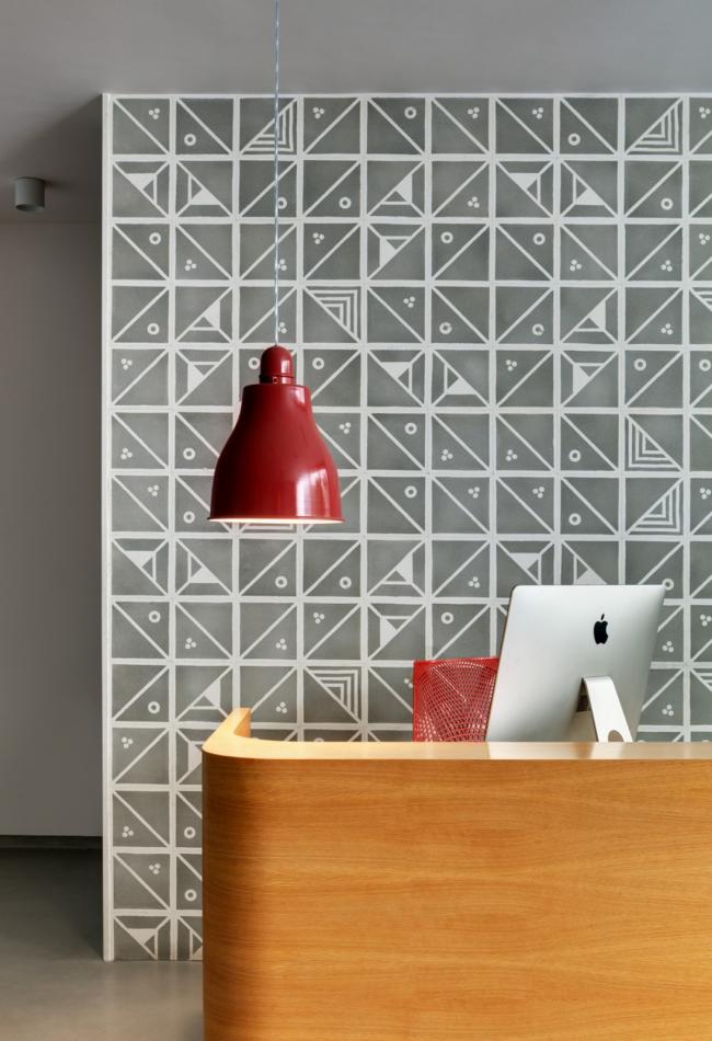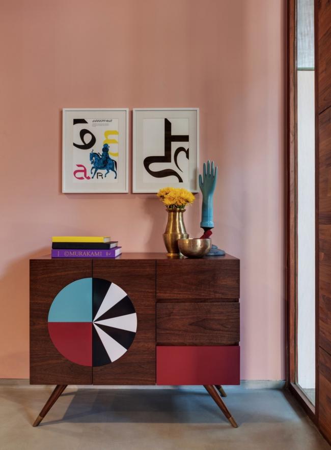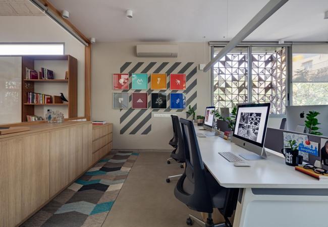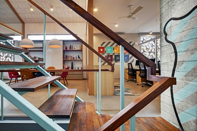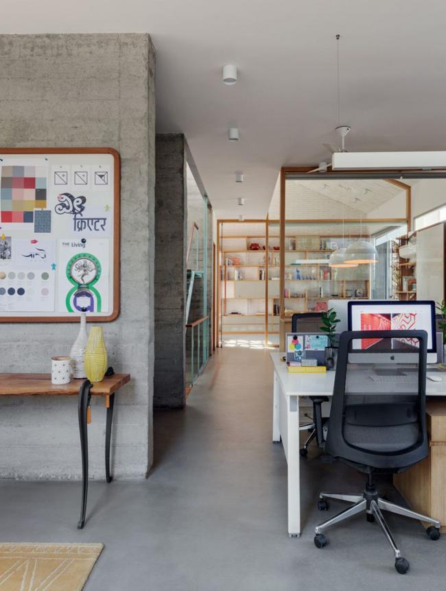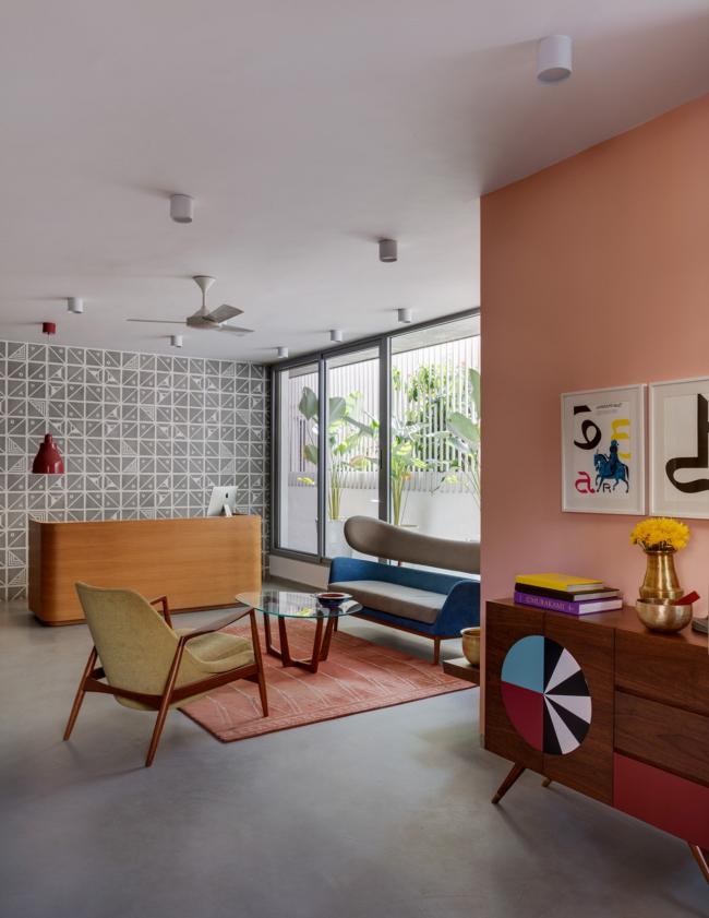 工作室所使用的材料具有纹理,但同时也保持了单色性。这里有砖墙、涂成白色的 Kerala 屋面瓦、成品混凝土、找平的水泥地面和带有图案的水磨石。散落在环境和家具中的流行色彩,以及浅色橡木橱柜形成了对比,并打造了一个温暖的氛围。特别令人愉悦的是入口接待处的图样控制台,由 Sandeep 和 Tania 设计。