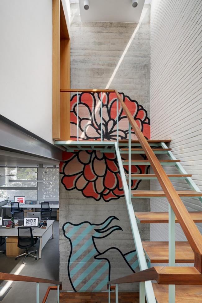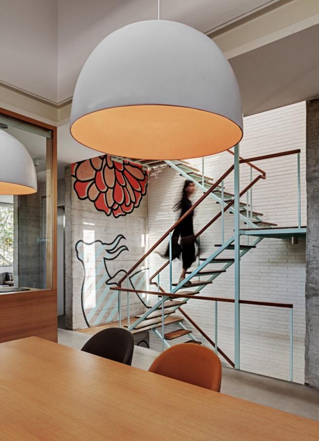 在建筑中开辟空间来培养创造力并促进设计师之间的合作。最突出的特点是一个轻巧的粉蓝色钢制和木制混合楼梯,像一个贯通三层高工作室的垂直脊柱。这个戏剧化的体量白天沐浴在自然光线下。沿着墙壁垂直攀爬的图画使这个楼梯更加突显,它也成为了一个相遇的空间、交谈的场所,你可以在这里停顿或继续疯狂的一天。