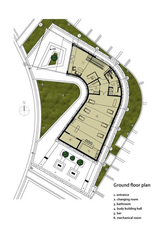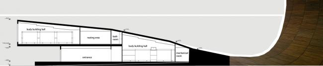 整座建筑用地面积约745平方米,建筑首层约235平方米,包括大厅、健身厅、浴室、更衣室和酒吧。二层约170平方米,设有另一个大厅、更衣室、酒吧以及休憩区。室内设计的理念就是创建一个让人仿佛置身在室外的运动空间。