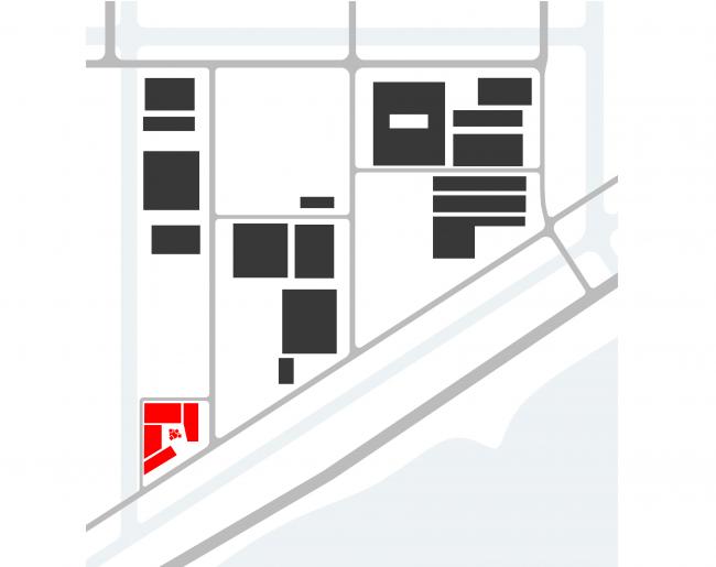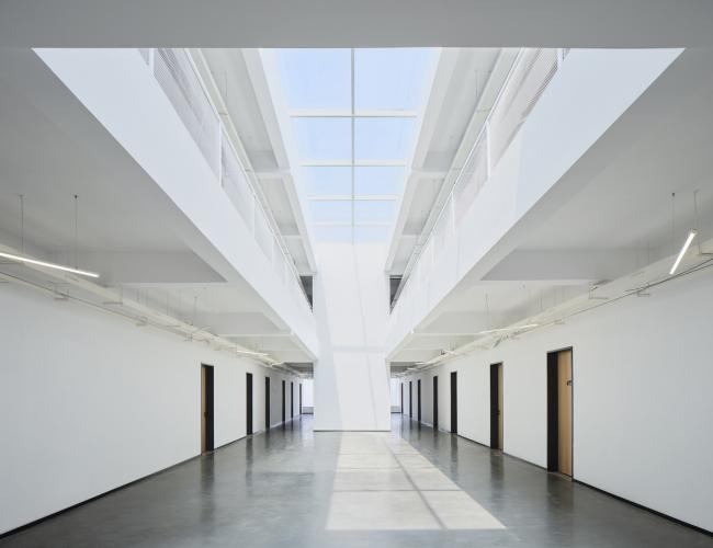 从基于生产的物流考虑,建筑师将沿场地边四栋体量最大程度地外推贴边布置,并与外围环形车道连接以实现高效物流进出,在场地中央的剩余空间形成了一个回归生活的内院。