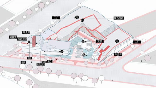 在深入了解了业主企业的生产工艺要求、踏勘了场地和进行了反复多轮的推演之后,建筑师决定将设计的主要切入点回归到最为基本的要素——“流线”上。在此,流线的含义不仅在于实现产业生产所需的工艺流程和货运流线,也包括了即将在此生活工作的产业工人与管理者的生活行为流线。