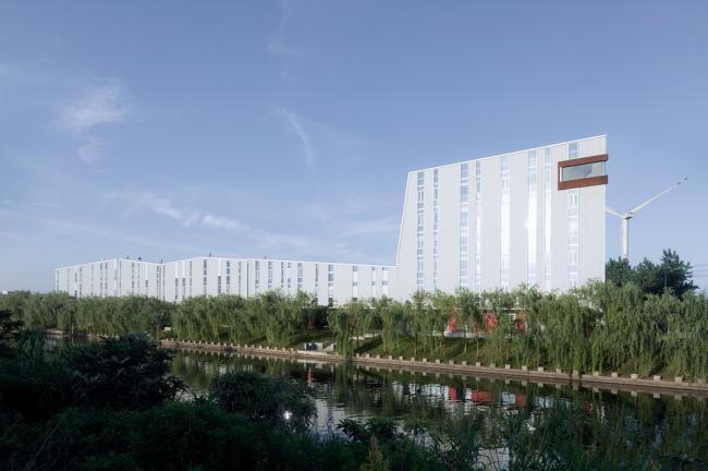 ▲ 从水池望向西侧员工宿舍©存在建筑-建筑摄影