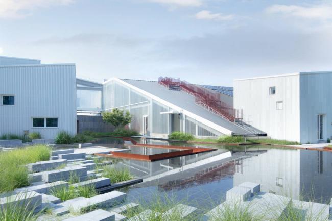 浙江普利斐特,作为一家在汽车科技领域的创新型企业,在委托对这一位于海宁尖山新区、毗邻钱塘江入海口的用地进行设计的同时,提出了期望跳脱遍布其用地周围的传统产业园区空间模式的要求。这一期望与建筑师自身对于传统产业园区的反思不谋而合,使得我们得以将更多的精力投入在探索实现这一共同诉求的路径可能性上。