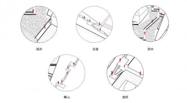 与此共生的还有丰富的线性体验:观岸、攀山、走崖、渡桥、游水。水中相望为观岸,匍匐上行为攀山、建筑立面为走崖、串联通道为渡桥,水中曲折为游水。与江南建筑情、趣、神的园林意境不谋而合。