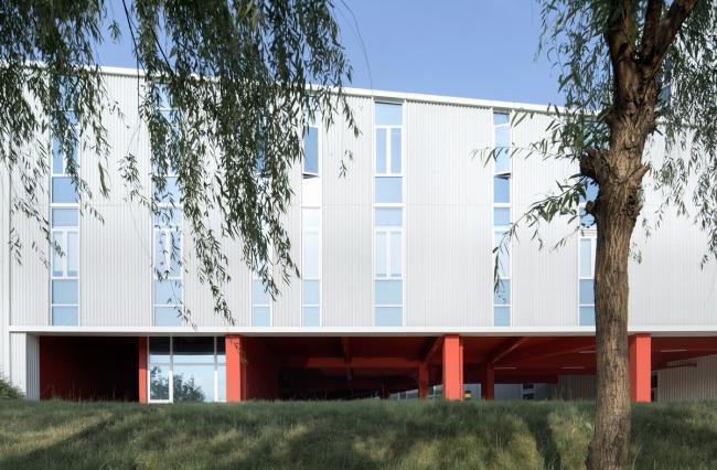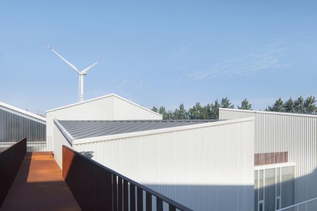面向外部,建筑外墙通体饰以白色瓦楞钢板,纵向的条窗、瓦楞纹理及折面屋顶构成了“山体”的干练、简洁的“实面”肌理。