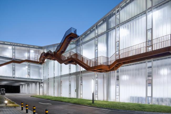 建筑师抽取了车间的疏散楼梯、屋顶太阳能板的检修马道、跨越水池的小径、办公楼的室内楼梯,覆以统一的耐候钢板,或将之外化可视,或将之下沉消隐,又或使之穿层飞楼,还原了中国传统的山水绘画中的若隐若现、似断实连、曲折回绕的山径,并进一步构成了串联所有图景要素的核心线索——不仅是可视的,也是可游和堪用的。