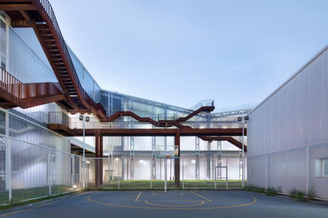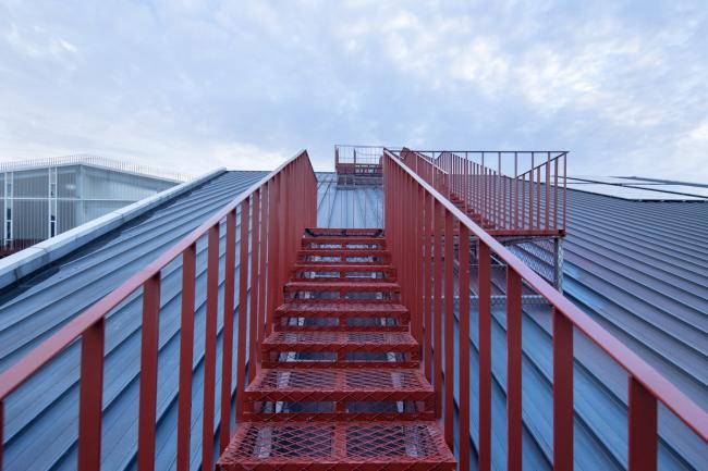 疏散楼梯和走道辅助流线布置在车间功能区块外侧,使得内部空间的再划分变得更加自由。墙面外挂的廊道和楼梯为工人通向食堂、宿舍提供了便捷路径,也是工人短暂工间休息的场所。屋顶上的楼梯为顶部太阳能板的检修提供了便利,也是工余登高望远的户外活动空间。