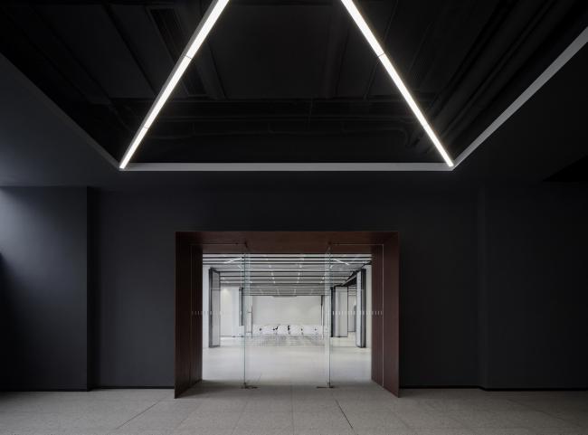 偶遇,耐候钢折边门厅突显仪式感,呼应外立面的特质同时缓冲内外空间转换。顶面引入半通透的金属拉网板作为主要的元素,结合T8灯管和线性条形灯,与裸露的原始建筑结构,使得顶部空间具有丰富的可读性和延展性。
