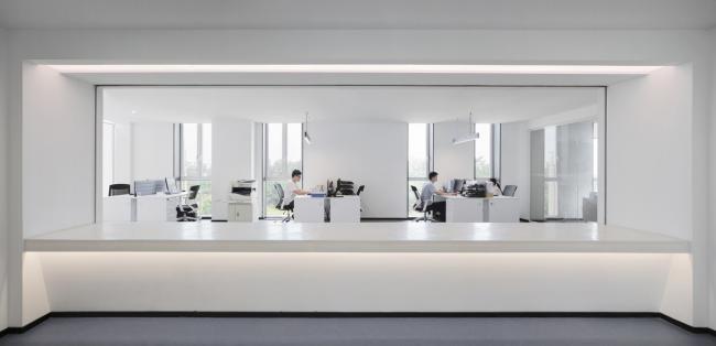面向园区内部,连续的U玻构成了一种连续的半透明状态,并在白天与夜间形成了完全不同的质感——日间的清冷与夜间的温润。建筑以轻盈姿态依水而立,隐隐透过立面映射出建筑内日常的工作和活动。