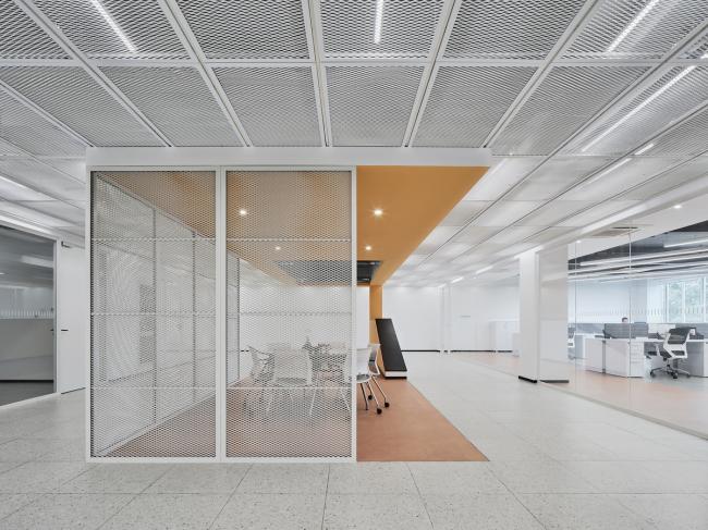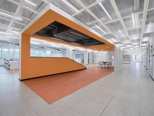 再探是公共区域放置的“村院”。在办公室区域中间设置由轻质的金属网的半围合空间,介入温暖的颜色,既是共享工作空间也是提供小憩的室内“庭院”。