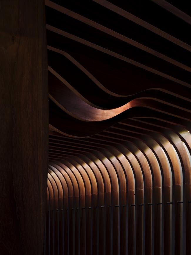 暗红色锈板的曲桥采用下沉式设计,让人更加亲近水面,连同建筑屋顶上弯曲的亮红色栈道,在场地上盘桓贯连,让人有如山行,如水游的感受。