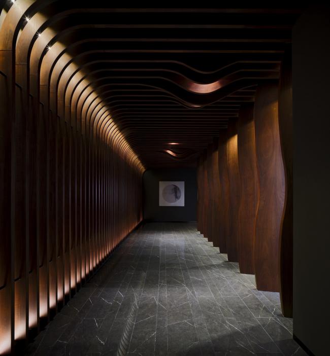 望远,到达建筑的至高层,是业主的私人接待及办公空间。入口区域吊顶和墙面用整木方实现水波纹的效果,呼应远处钱塘江浪潮。