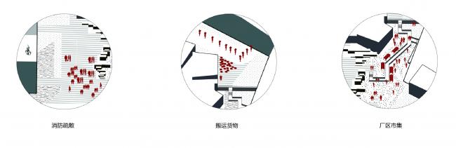 个体的实践、感受和认知是阐释空间和地方性意义的组成部分。当工人们走上屋顶,在池边戏水,在下沉广场里举办热闹的市集,工业园已不再是装载冰冷机器的厂房,而是紧密结合的群体在其内部活动发挥各自功能的聚落。