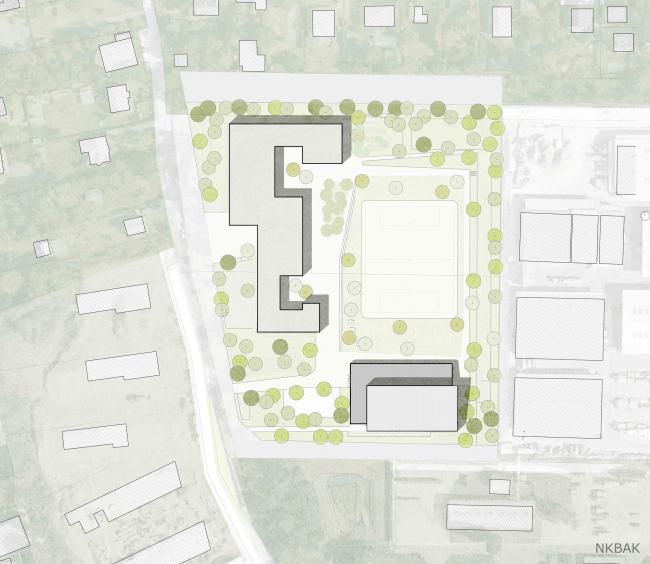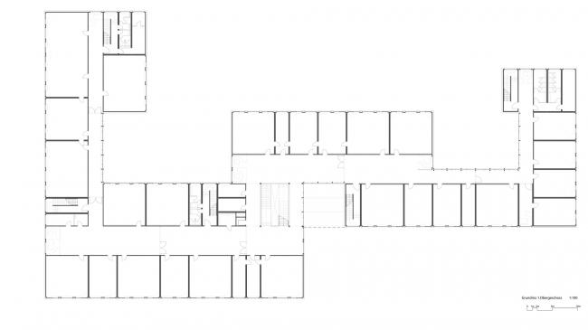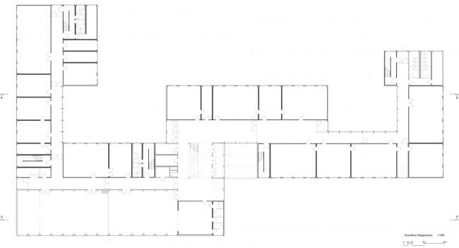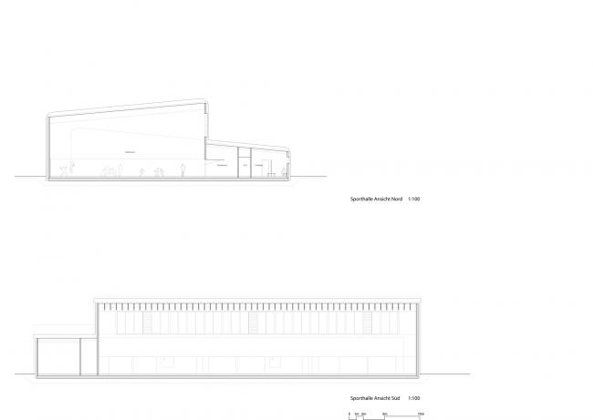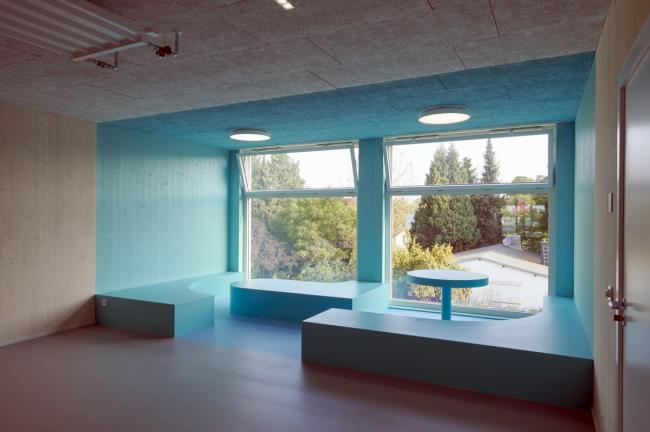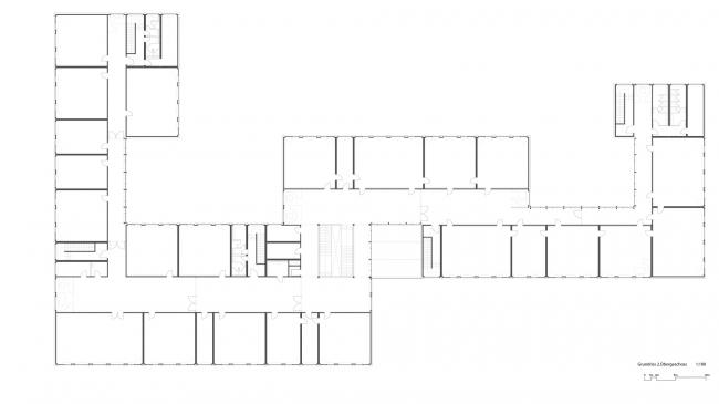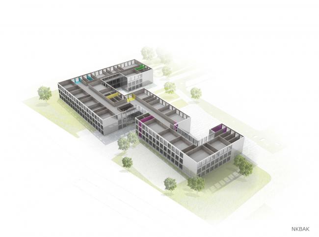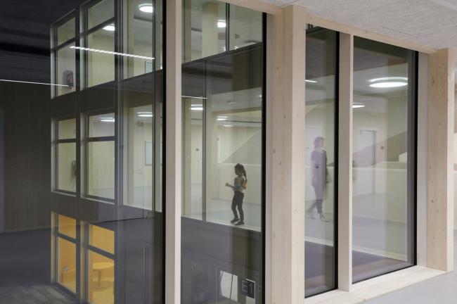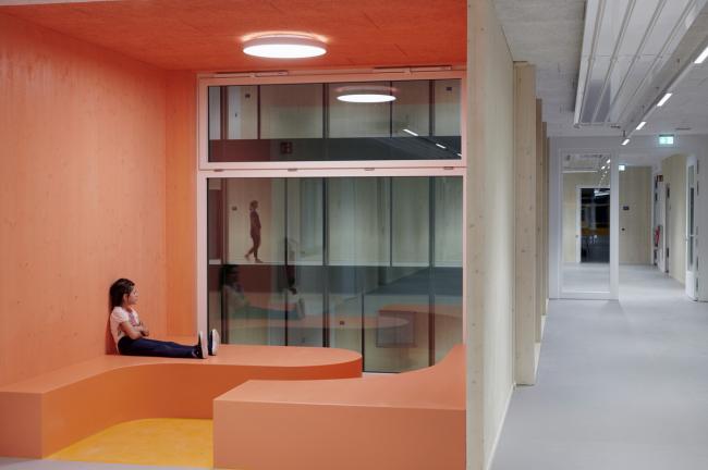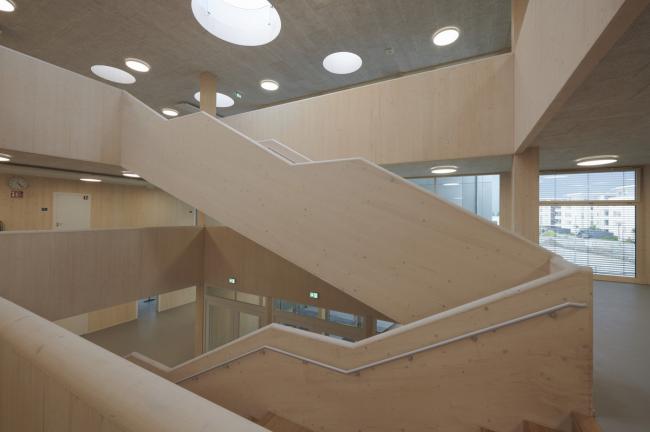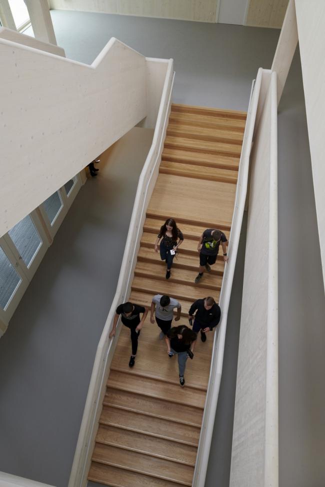 学校建筑通过中央入口区 – 大厅进入。通过大厅的五个楼梯间和一个开放式楼梯可以垂直进入建筑物。学校共有32个不同大小的教室。底楼设有一间可延展的大型多功能厅,相邻的厨房和食品柜台也可作为用餐室。专业的教室,行政房间以及工作和储藏室为学校要求的空间。大厅是学校的心脏,是大家共同聚会场所。所有楼层均位于建筑物中间,连接的方式非常清楚明了。另外五个楼梯间为垂直通道,同时可以帮助大家在需要的时候轻松逃离建筑物。这些楼梯间旁边是必要的辅助和技术室。