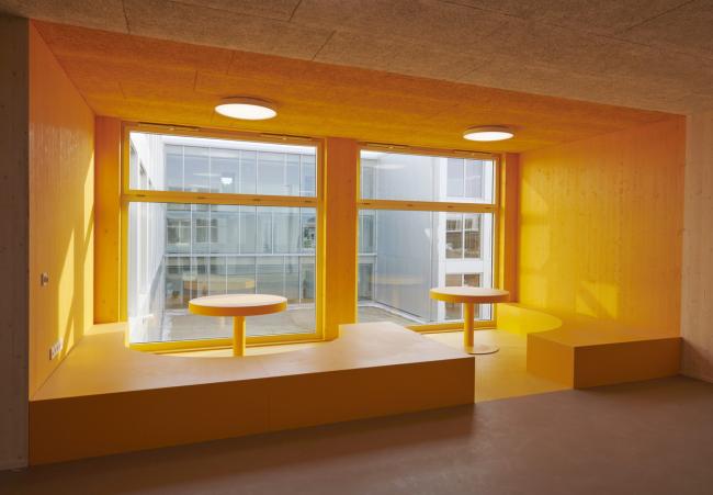 在较高楼层,教室可以直接通往大厅的北部和南部。超宽的走廊展示了空间的重要性和使用的方式,明亮和轻盈的氛围允许自由和友好的交流。色彩对比下的休闲区域更加的出挑,易于被找到,与同样彩色的楼梯间相映成趣。