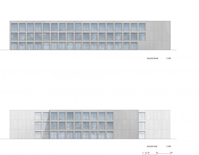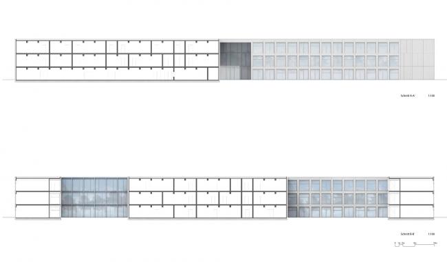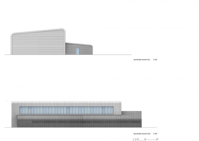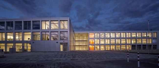学校建筑为南北方向,修长的折线结构,教室外墙大多为东西朝向,行政和专科教室分别安排在朝北和朝南的区域。外立面的设计反映了内部空间的使用,所有可用的空间均由垂直或者水平分科的大型玻璃外墙分隔。走廊采用了完全透明的玻璃幕墙,所有的玻璃表面,除了朝北的立面以外全部配备了垂直的遮阳装置,在不透明的外立面覆盖了大型的铝板。屋顶绿化广泛,雨水管道均铺在立面前,使得排查的工作很容易进行。