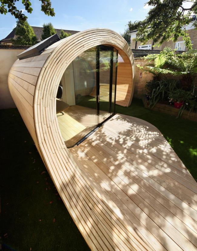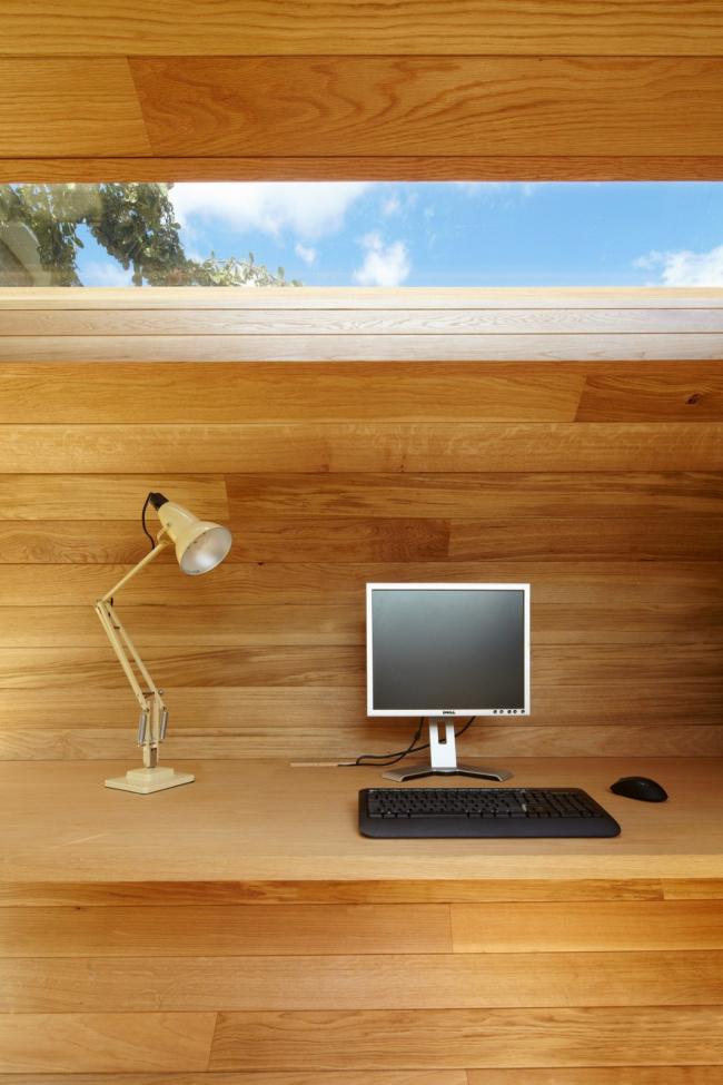 一个开大玻璃窗的办公空间掩映于挤压材形成的椭圆外壳中,这个外壳本身的卷动就像一个刨花,并草坪的形(BIM设计)成一个小露台。室内由橡木铺装,并配备了具有存储柜的悬臂式办公桌。两个采光天窗——一个开在办公桌上面,另一个在办公室外向天空开放,带来明亮的工作空间。