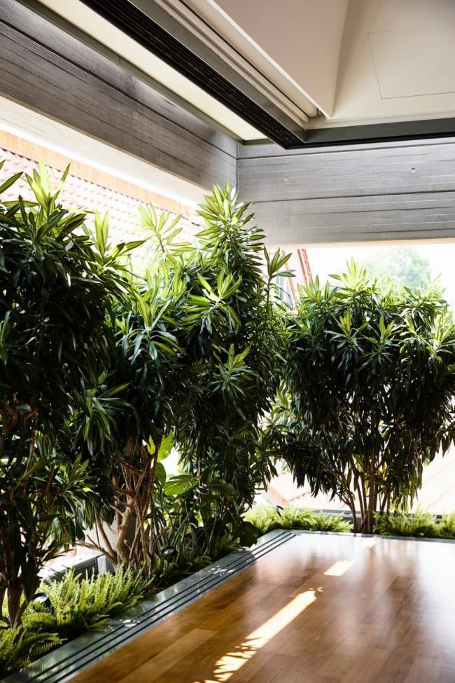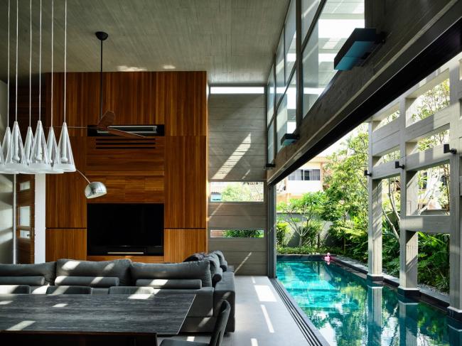 悬在游泳池和部分住宅之上的混凝土网格模糊了室内和室外之间的界限。毫无疑问,泳池延伸到了住宅的深处,从而成为了其周围三倍容积“庭院”的规划重点。室内一整排的带框开口把其面对的室外绿植引入成为室内景观,成功活化了空间体验。