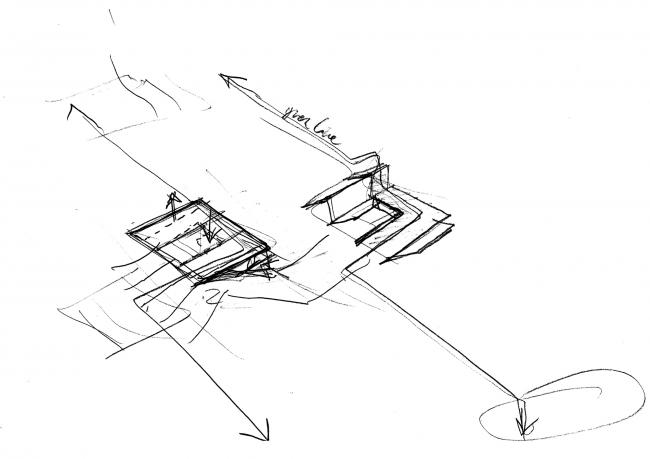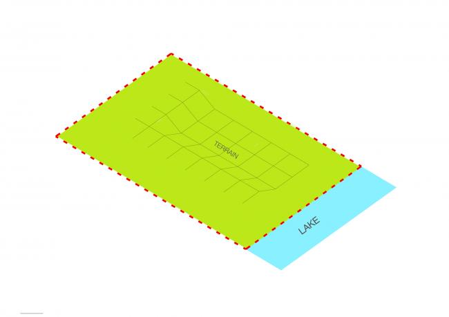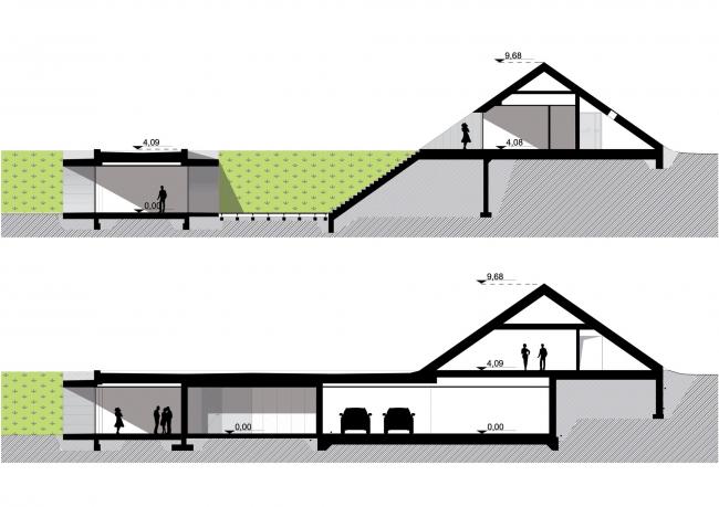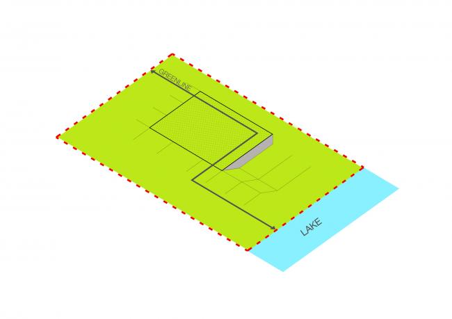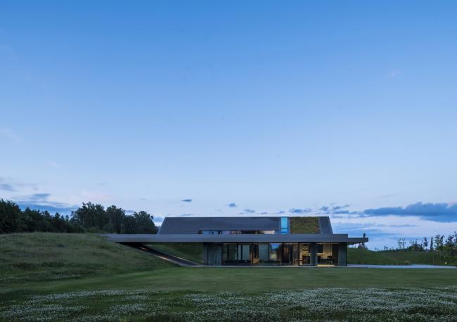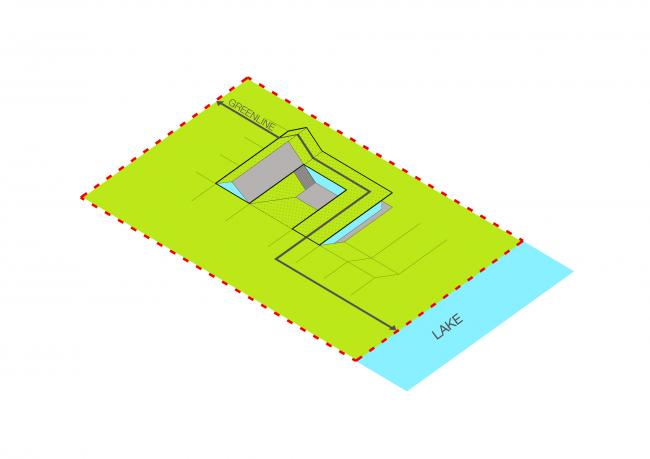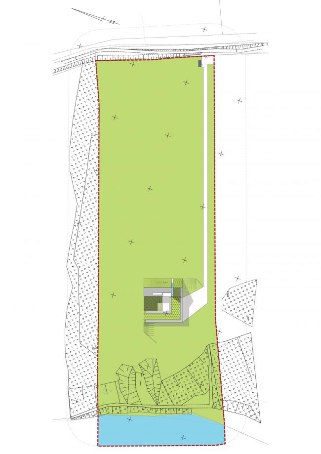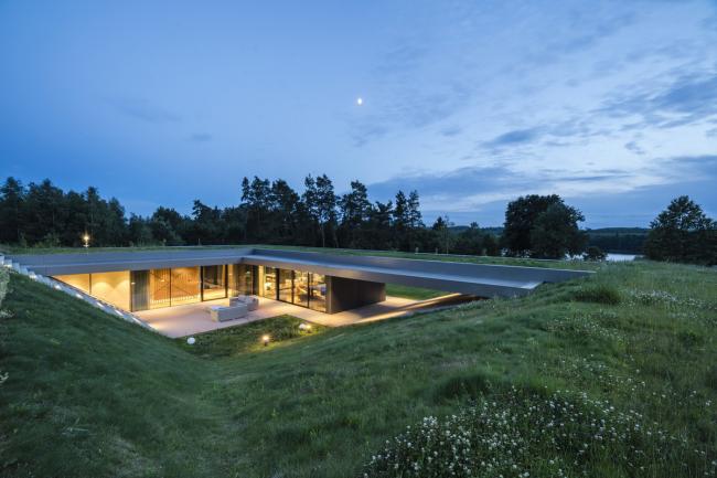 房子只占用了地块的一小部分。地块呈现一个自然的折叠形态,这也是该建筑物设计的起点。一块90厘米的钢筋混凝土板悬挂在下降的地形之上,形成了上部立面的延伸。它形成了一条独特的倾斜线条,(BIM工作)正是这条线赋予了建筑物以名称和特点。由柱网支撑的钢筋混凝土板为房屋提供了清晰的分区,将其分为位于一楼的起居区和位于楼上的卧室区。建筑物的水平布局更加与众不同,屋顶绿色线条相对于底层不断移动。它给人的印象是一道自然形成的水平裂缝,同时向湖面开放。
