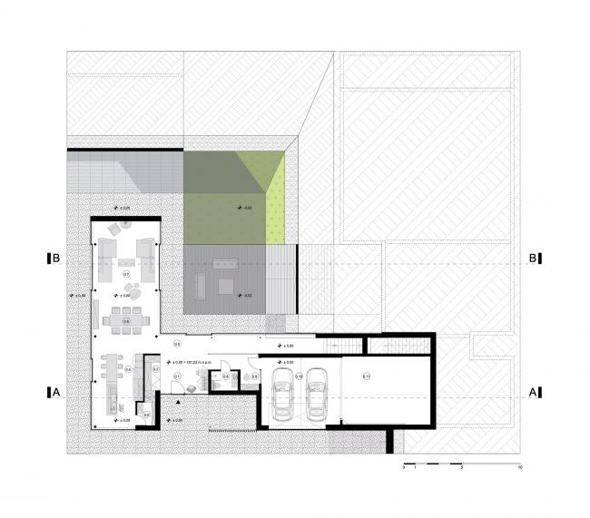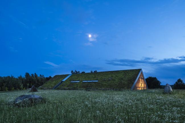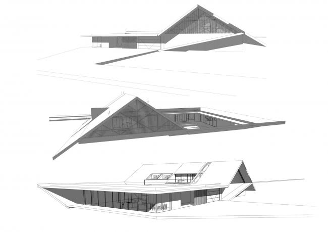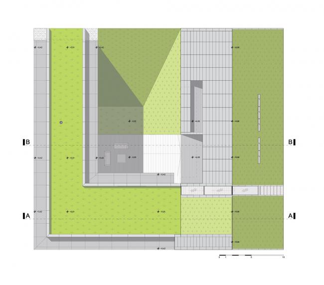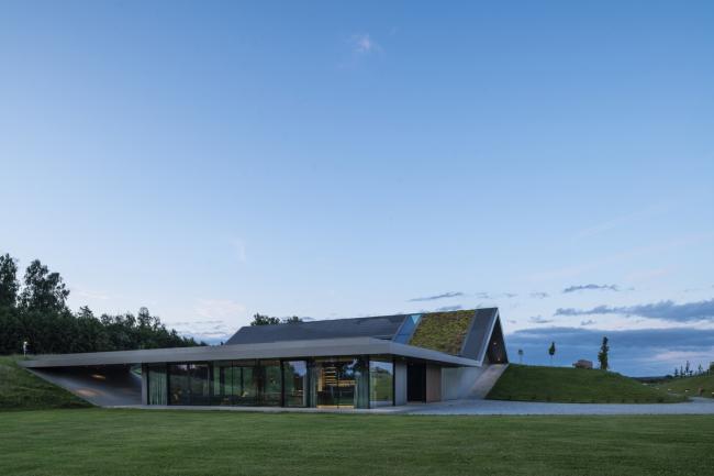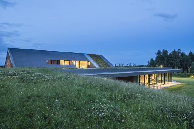 垂直的天窗是屋顶部分的一个细节,它不对称地划分了斜坡,将内部的私密区域向周围环境打开。建筑物的屋顶大部分都被草覆盖,只在开放式中庭一侧使用混凝土板。这种美学的考虑旨在强调建筑的现代性。