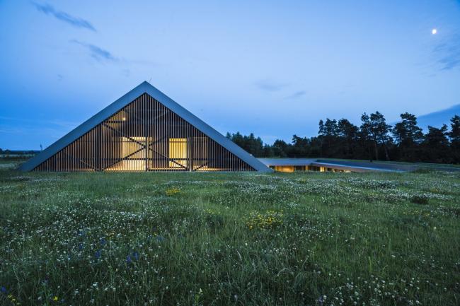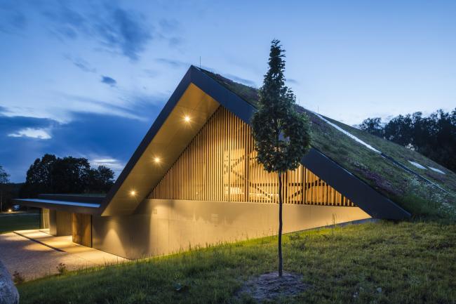 字母“L”形式的建筑布局反过来再现了Warmian-Masurian Voivodeship的传统农场空间组织。外立面主要是玻璃墙,再辅以铝板和陶瓷。山墙上补充有木质薄片细节,可以清楚地看出对Warmian-Masurian小屋山墙的模仿,这些小屋通常以各种方式排列的木板装饰。经过简化的45度坡屋顶形式也参考了传统的农村建筑。