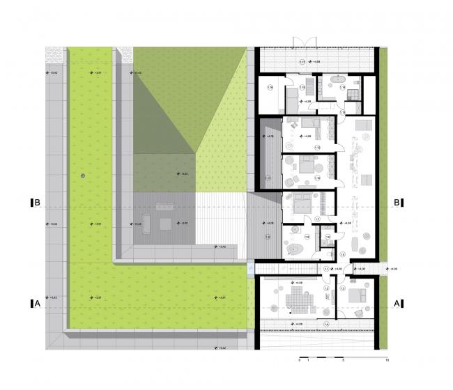 内部中庭增强了私密感。大窗帘可以根据需要关闭或打开,从而打开或关闭庭院。底楼的角落被玻璃墙围绕,为自由平面,可以俯瞰西南方,(BIM建筑)同时保证自然光线可供居民使用。