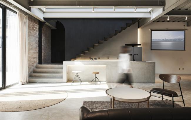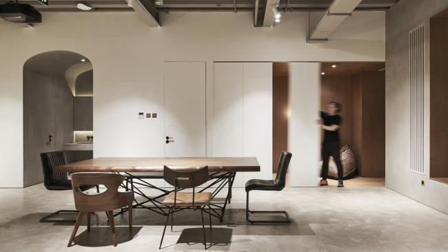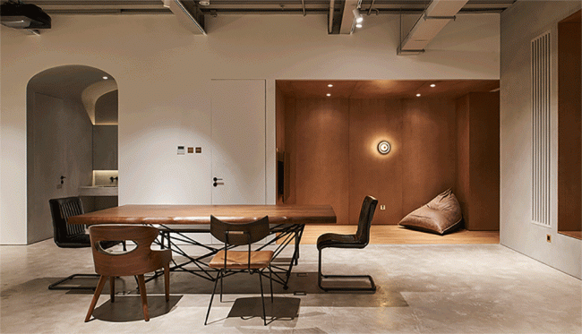一层空间多为沟通交流的功能属性,使用了大面积的暖白色及水泥涂料对于墙面、地面和天花进行喷涂, 具有颗粒感的肌理表面营造出粗粝却有温暖感的空间氛围。