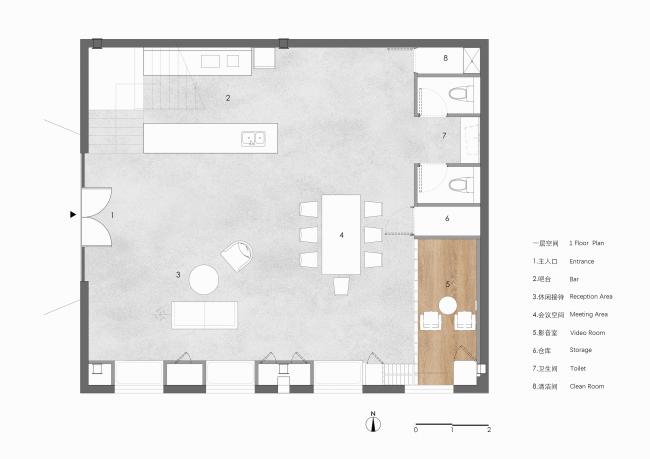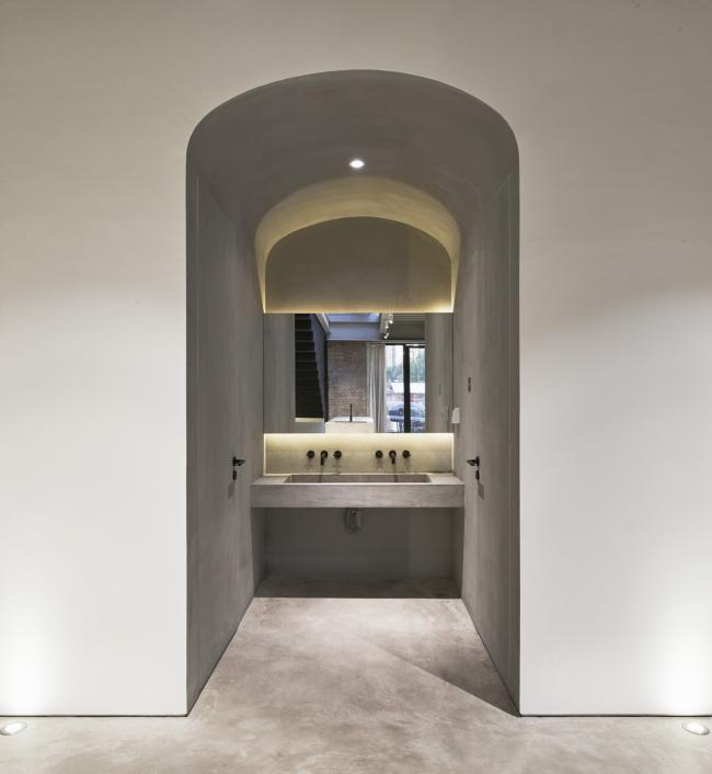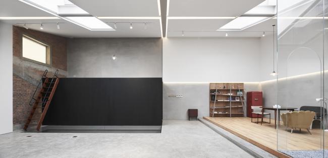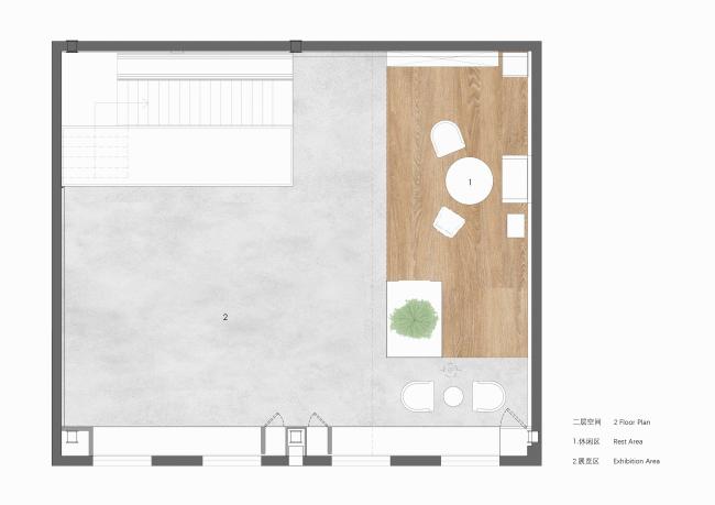 二层空间的工业建筑痕迹被妥善保留并做清洁处理,并搭配白色和水泥色作为空间主色。谜使用了平面构成的方式对于空间的每个立面的颜色、肌理、比例进行整理研究,希望打造出具有几何秩序感的多表情空间形态。