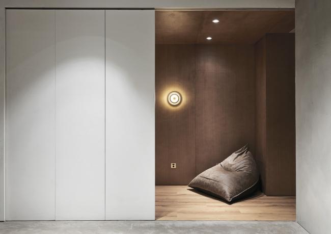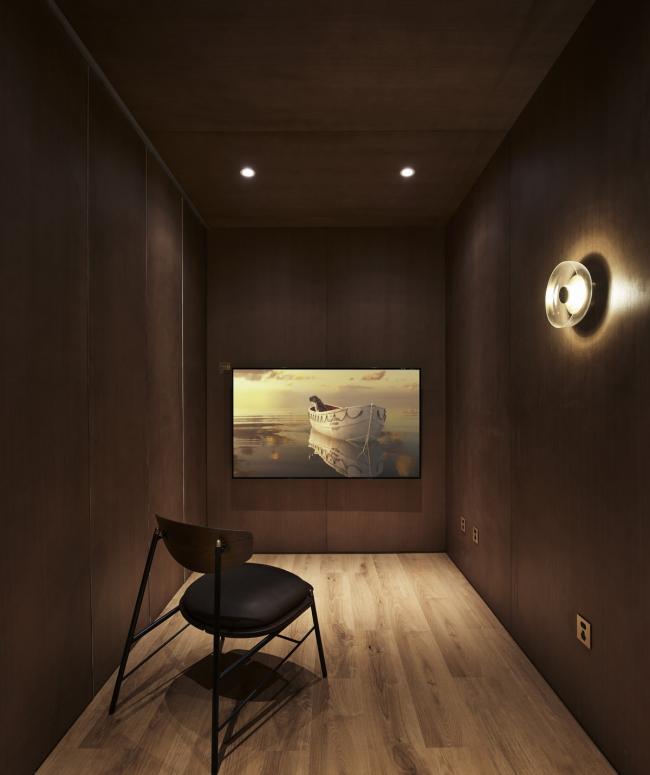 一层的角落处设置了一个非常私密的影音空间,空间整体以木饰面包裹,创造出极为纯粹的空间体验。立面设置移动滑门,开放与封闭的不同状态可自由切换。